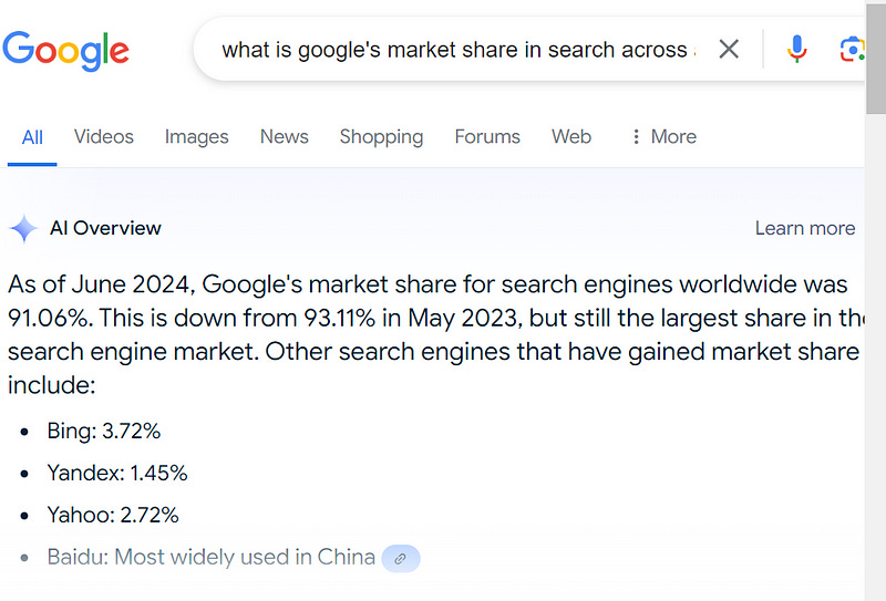 It is worth noting that Google is also trying to play the AI angle by using LLMs to generate an overview whenever users search for an answer.